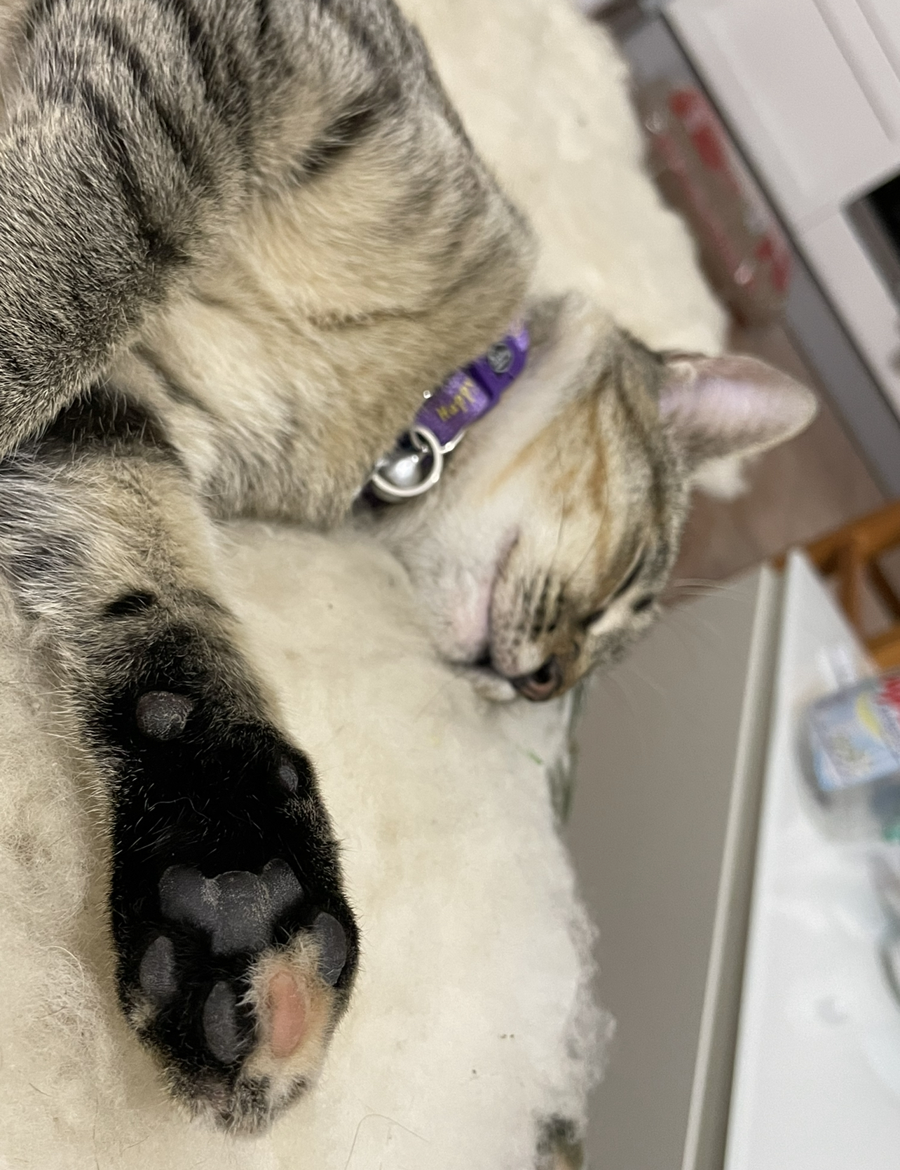 Tek sterilizrana , stomak joj je bio gol i tražila je prostor di se može pokriti i zavuči da joj se taj prostor grije,pronašla ga u našem krevetu… pametna kraljica carica Mimi :))))